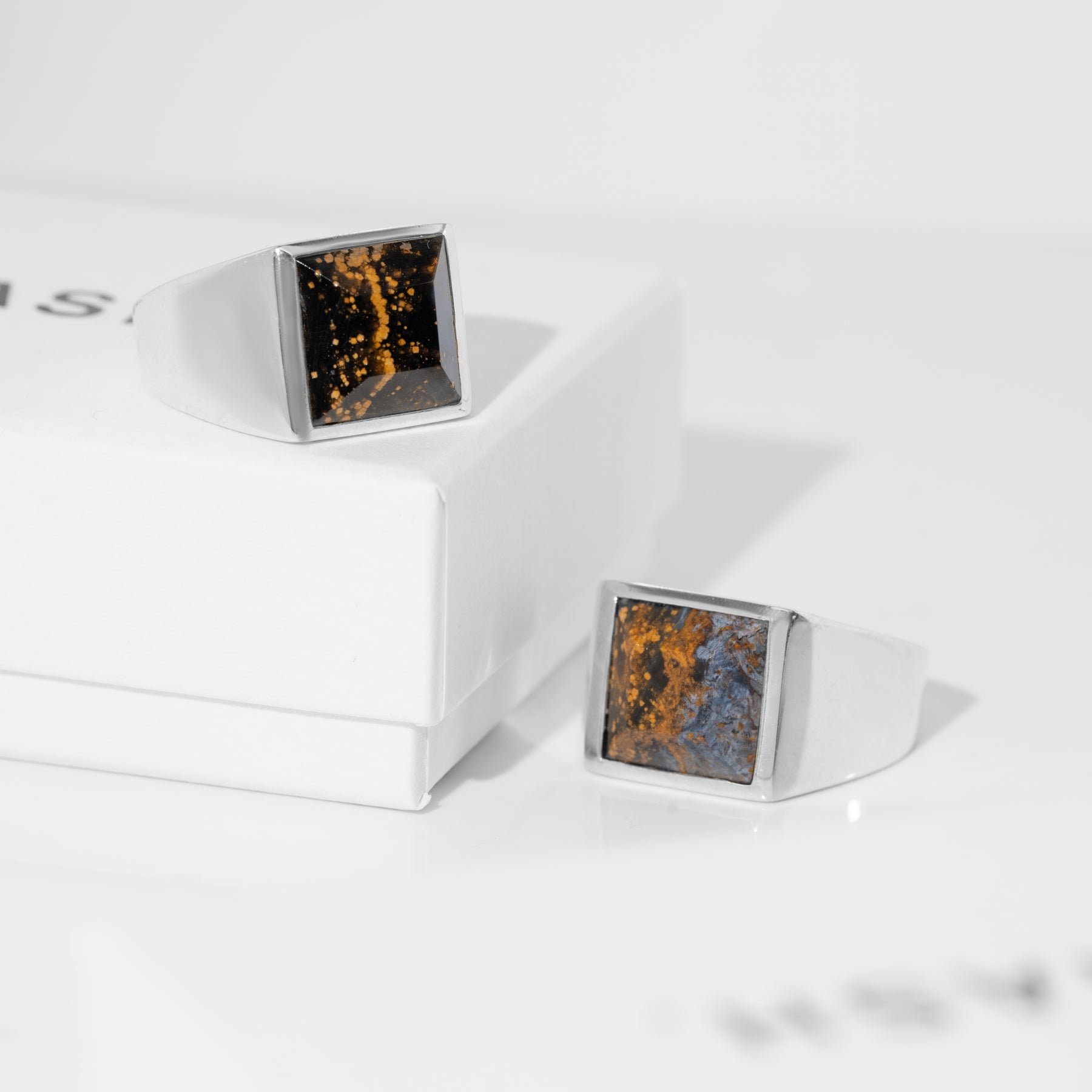 力強くも静かな表情を見せる天然石の個性を活かすよう、職人が一点一点スクエアカットを施し、シャープなシルエットが印象的なシルバーの台座と組み合わせました。