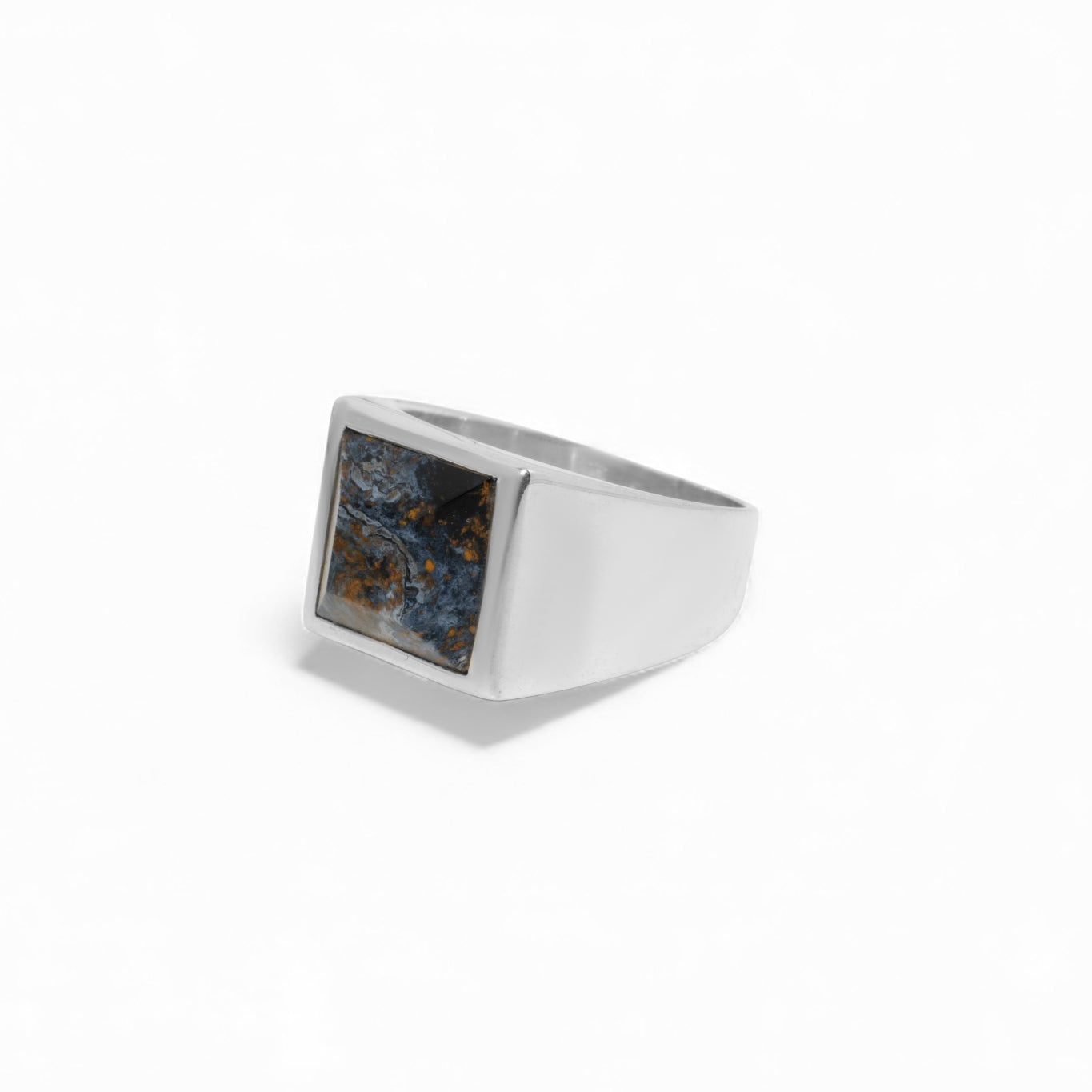 力強くも静かな表情を見せる天然石の個性を活かすよう、職人が一点一点スクエアカットを施し、シャープなシルエットが印象的なシルバーの台座と組み合わせました。